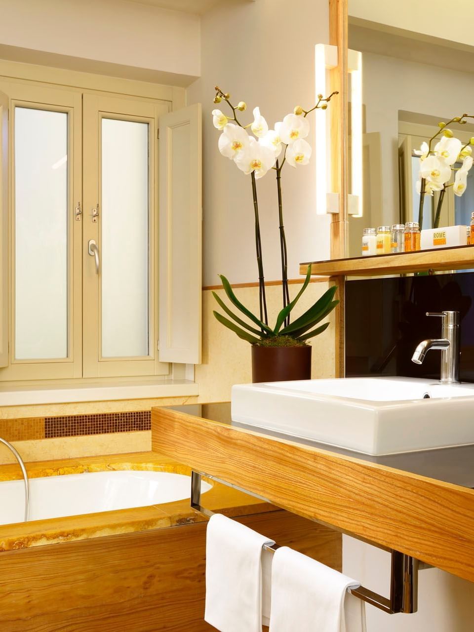 La junior suite porta le cose ad un livello superiore con un'ampia area salotto separata, un vasto bagno in marmo con sia vasca che doccia e lavandini separati per lui e per lei. Un invitantissimo letto king-size con lenzuola sontuose ti attende, insieme a tutte le moderne strutture di cui hai bisogno per una favolosa vacanza romana.